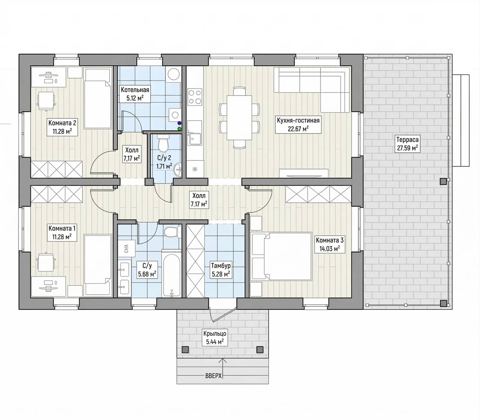 Одноэтажный дом площадью 117,25 м² с акцентом на уличное пространство: терраса 27,59 м² — одна из самых больших в линейке. Три жилые комнаты, два санузла, просторная кухня-гостиная и удобный холл. Компактные габариты 12 × 8,9 м при большой площади достигаются за счёт рациональной планировки.