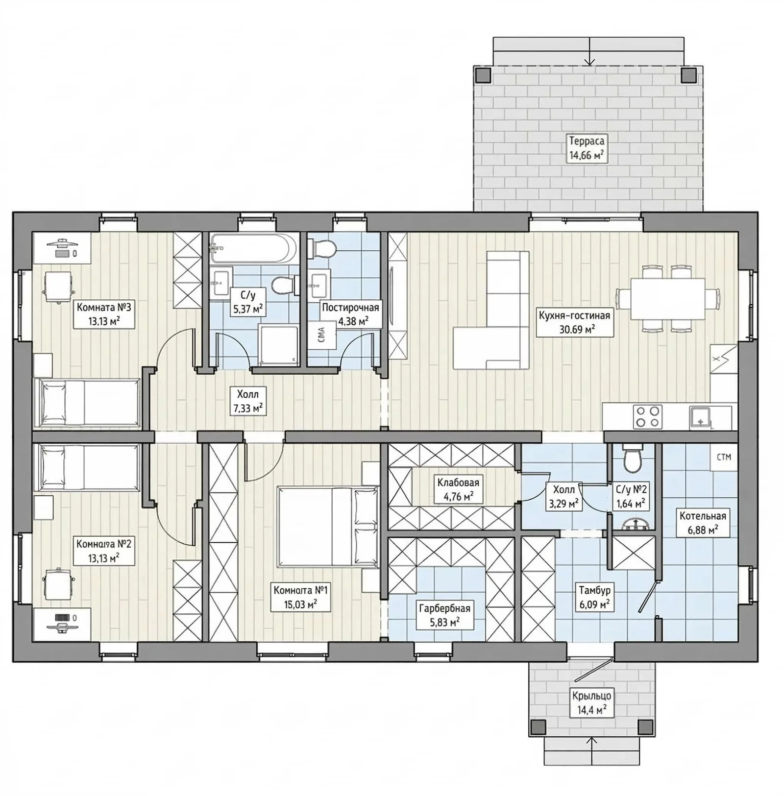 Одноэтажный дом площадью 136,23 м² — флагман линейки Bungalow. Продуманная функциональность: три жилые комнаты, два санузла, гардеробная при главной спальне, отдельная постирочная и кладовая. Кухня-гостиная 30,69 м² с выходом на террасу 14,66 м². Габариты 15,6 × 9,4 м.