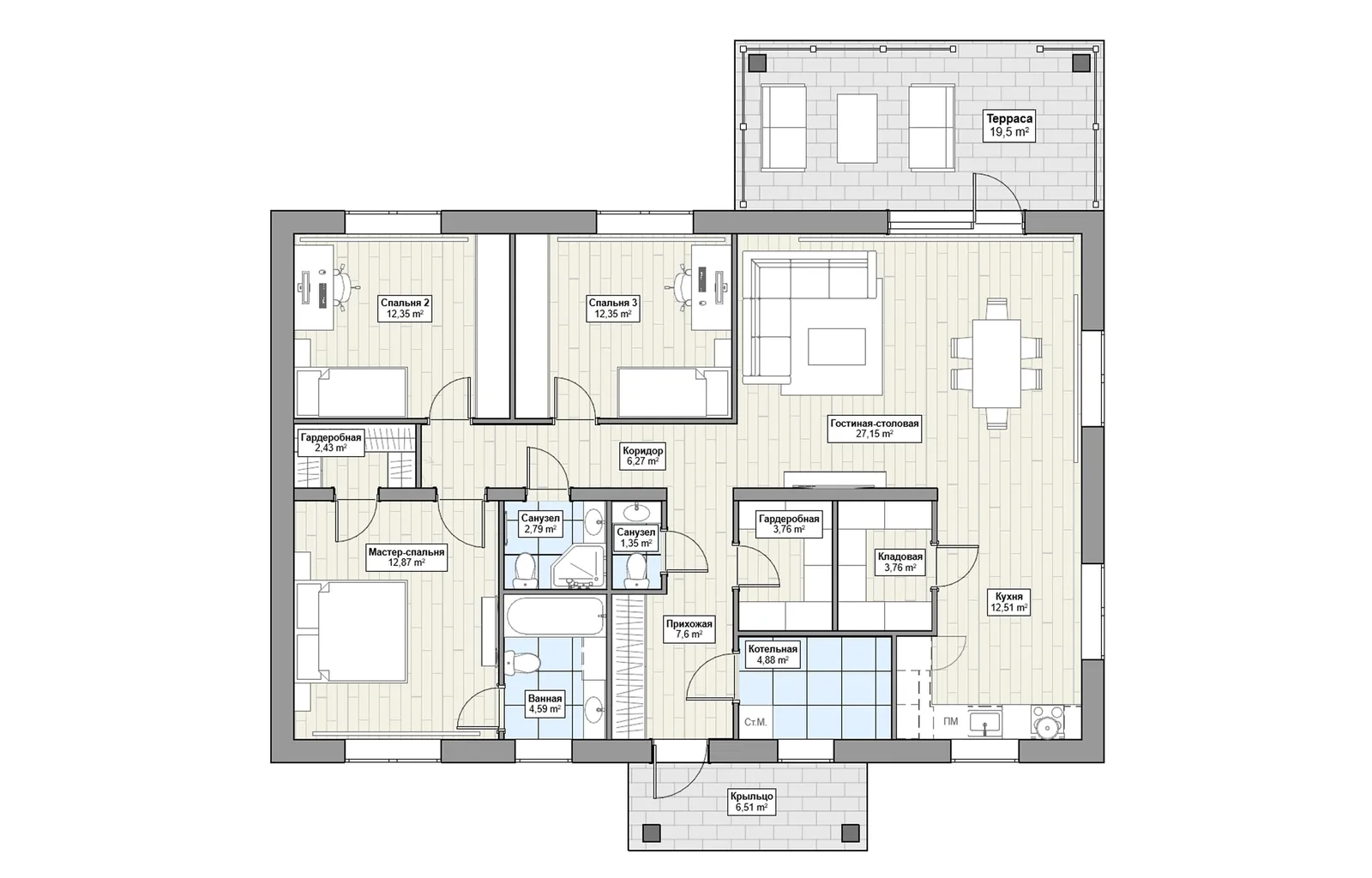 Одноэтажный дом площадью 171,66 м² с продуманной планировкой для семьи из 4–5 человек. Три спальни, включая мастер-спальню с гардеробной и отдельной ванной, просторная гостиная-столовая 27 м² и терраса 19,5 м² для отдыха на свежем воздухе. Габариты 13,6 × 16,7 м.