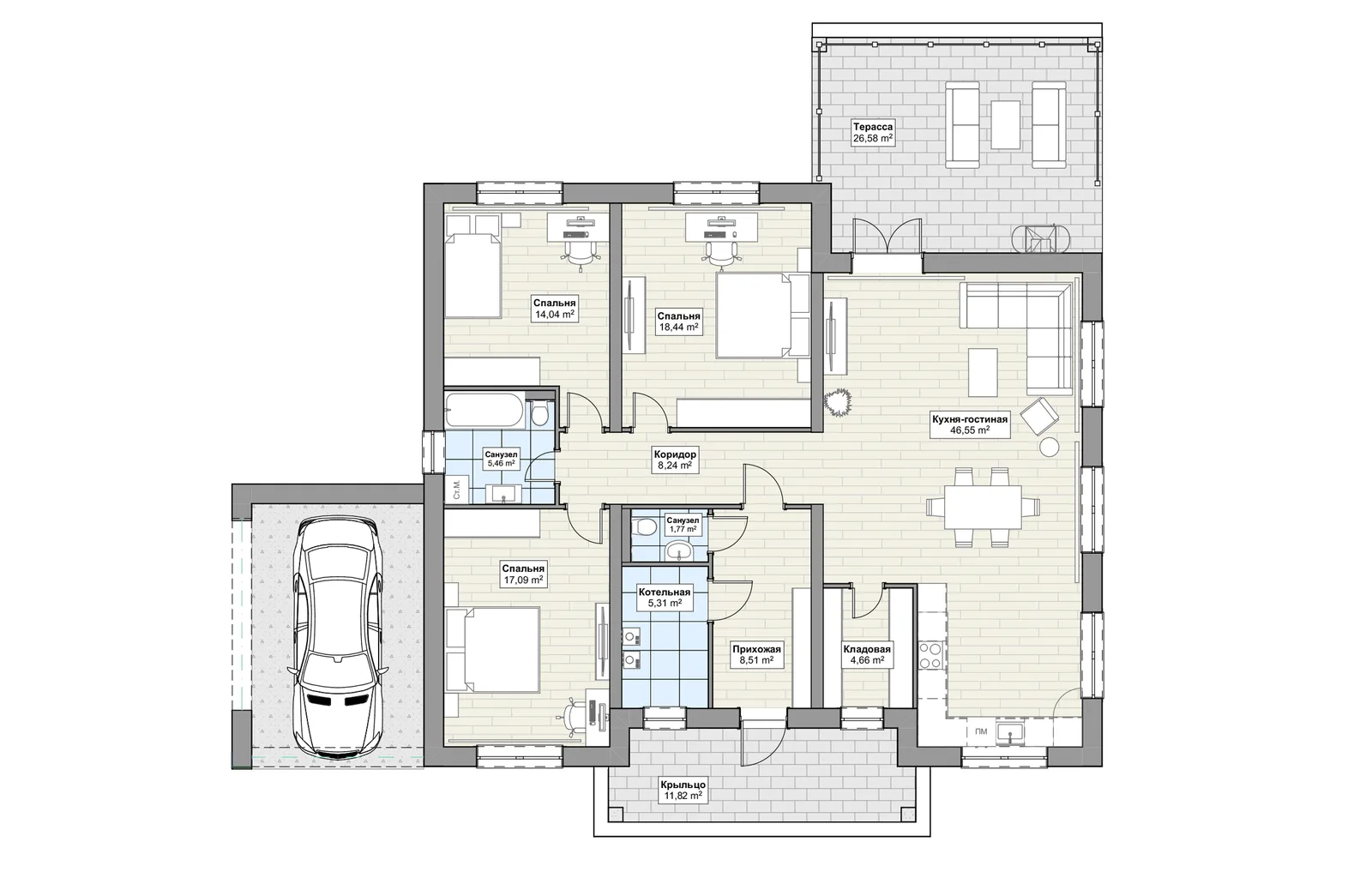 Просторный одноэтажный дом 226 м² с тремя спальнями и большим открытым пространством без коридора