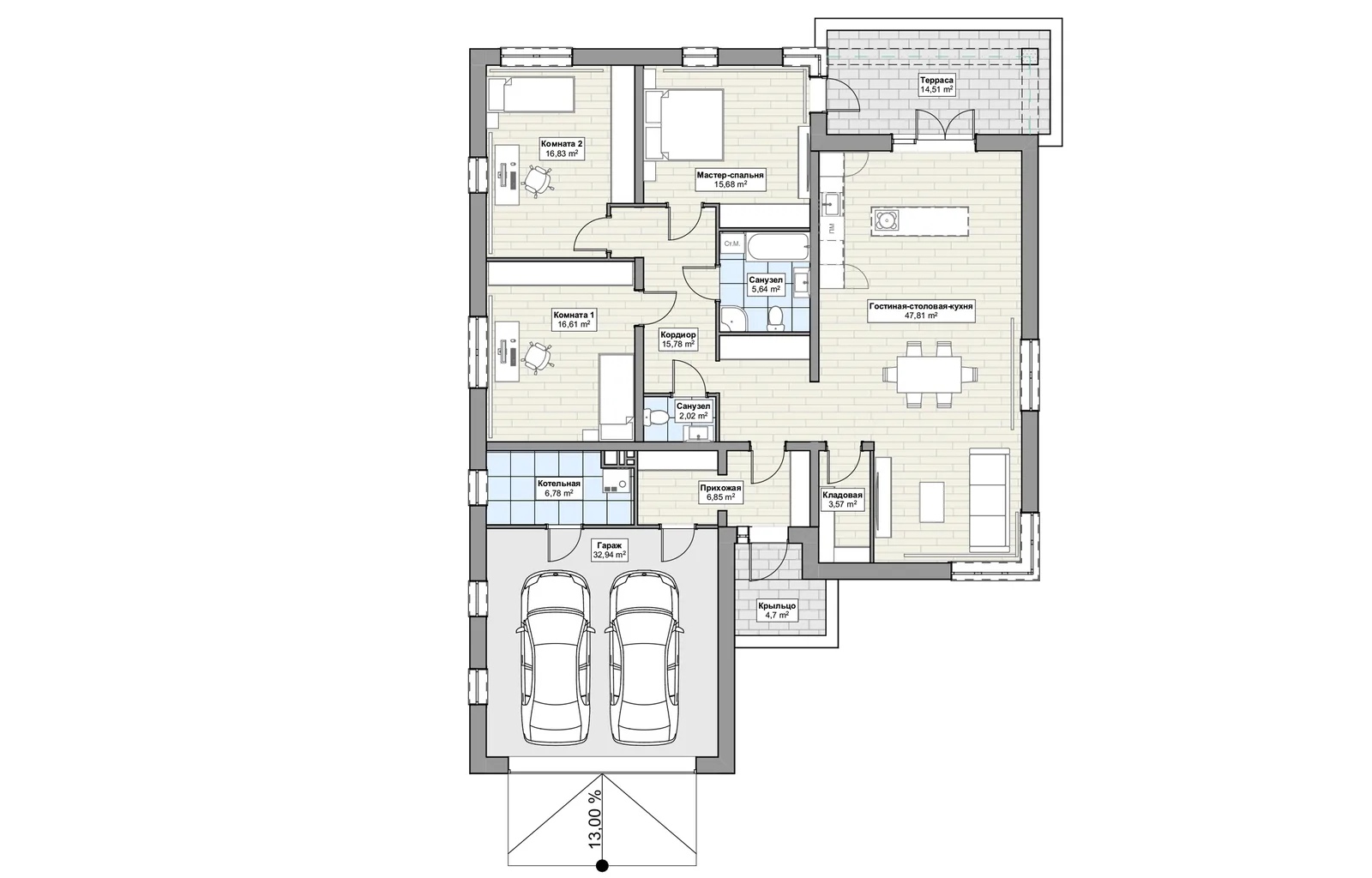 Одноэтажный дом площадью 235,23 м² — флагман линейки Bungalow. Продуманная функциональность: три жилые комнаты, два санузла, гардеробная при главной спальне, отдельная постирочная и кладовая. Кухня-гостиная 30,69 м² с выходом на террасу 14,66 м². Габариты 15,6 × 9,4 м.