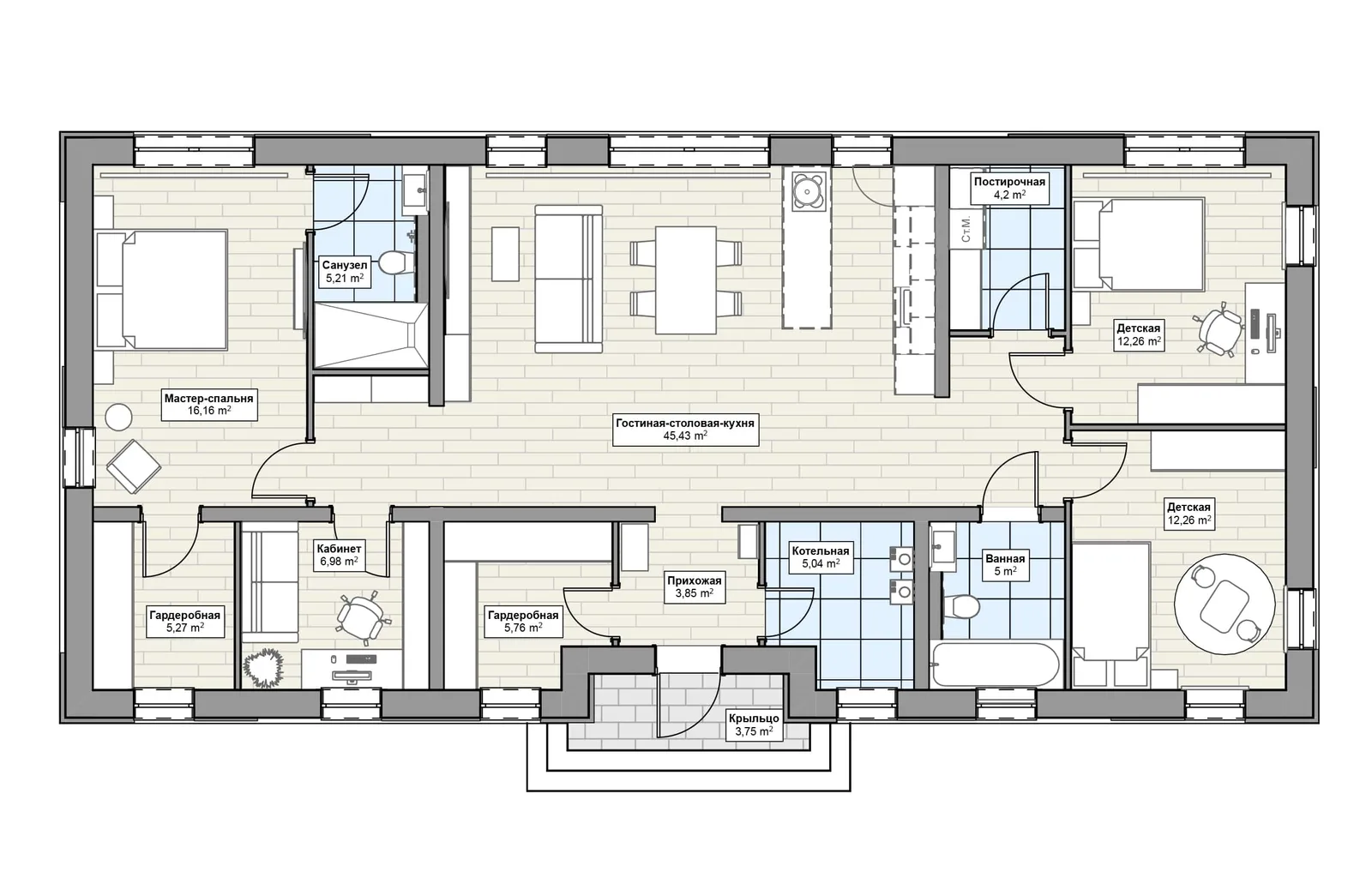 Просторный одноэтажный дом 169 м² с тремя спальнями и большим открытым пространством без коридора